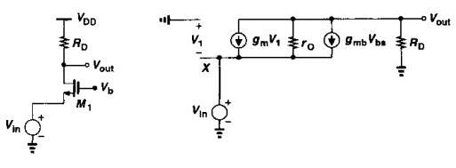 左圖中是直接耦合的共柵級,V b接固定電位,以電阻R D為負載。右圖為小信號等效電路(做圖水平拙劣),柵極接地,漏端輸出。該圖的輸出電阻(V i n = 0時兩壓控電流源都為零)很顯然為 r 0,負載電阻為 R D 。