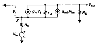 在結構上,我們看到該小信號電路與共源級非常相似,僅僅是輸入從柵源端改到了襯源端,電路本身的屬性(空載和帶載輸出電阻)并沒有發(fā)生變化,空載輸出電阻為[r o + R s + ( g m + g m b ) ? R s ? r o ]所以我們從公式直接得出結論。