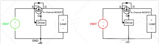 當(dāng)電池正確連接時(shí),即源極連接到 VBAT,要使 MOSFET 導(dǎo)通,柵源電壓(Vgs)必須高于閾值電壓(Vth)。因?yàn)樵礃O連接到 VBAT處,所以柵極電壓需要比 VBAT 高至少Vth(閾值電壓)。