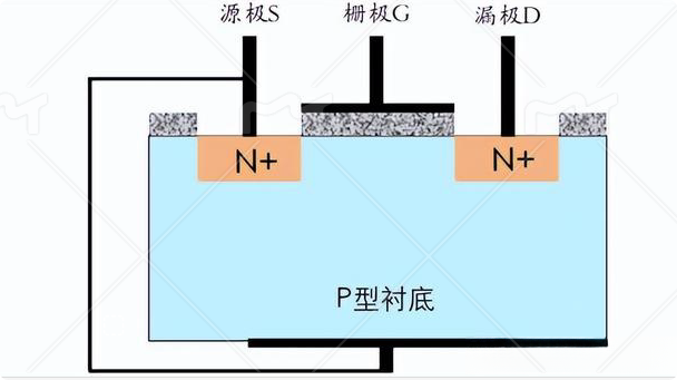 這個(gè)寄生二極管又叫體二極管,我們以NMOS管為例先說一下它是怎么來的。NMOS管是以P型半導(dǎo)體為襯底,在上面挖出兩個(gè)溝槽,然后填充摻雜濃度比較高的N型半導(dǎo)體,形成下面這種結(jié)構(gòu)。
