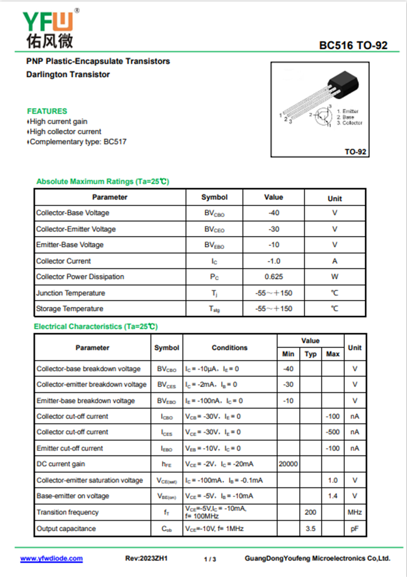 佑風(fēng)微原廠三極管BC516中文資料,PDF數(shù)據(jù)手冊,引腳圖,封裝規(guī)格,廠家原廠,找BC516上佑風(fēng)微電子官網(wǎng)