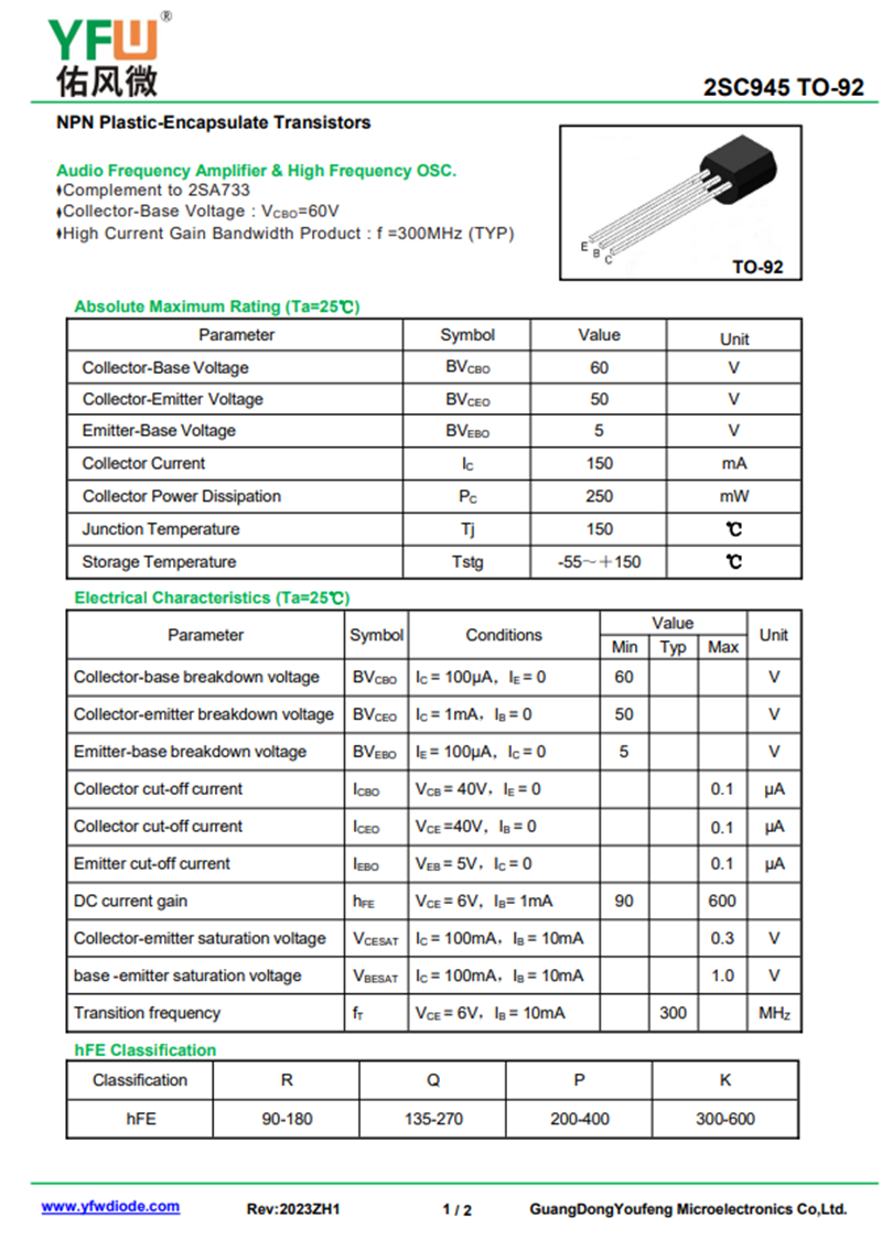 佑風微原廠三極管 2SC945中文資料,PDF數(shù)據(jù)手冊,引腳圖,封裝規(guī)格,廠家原廠,找2SC945上佑風微電子官網(wǎng)