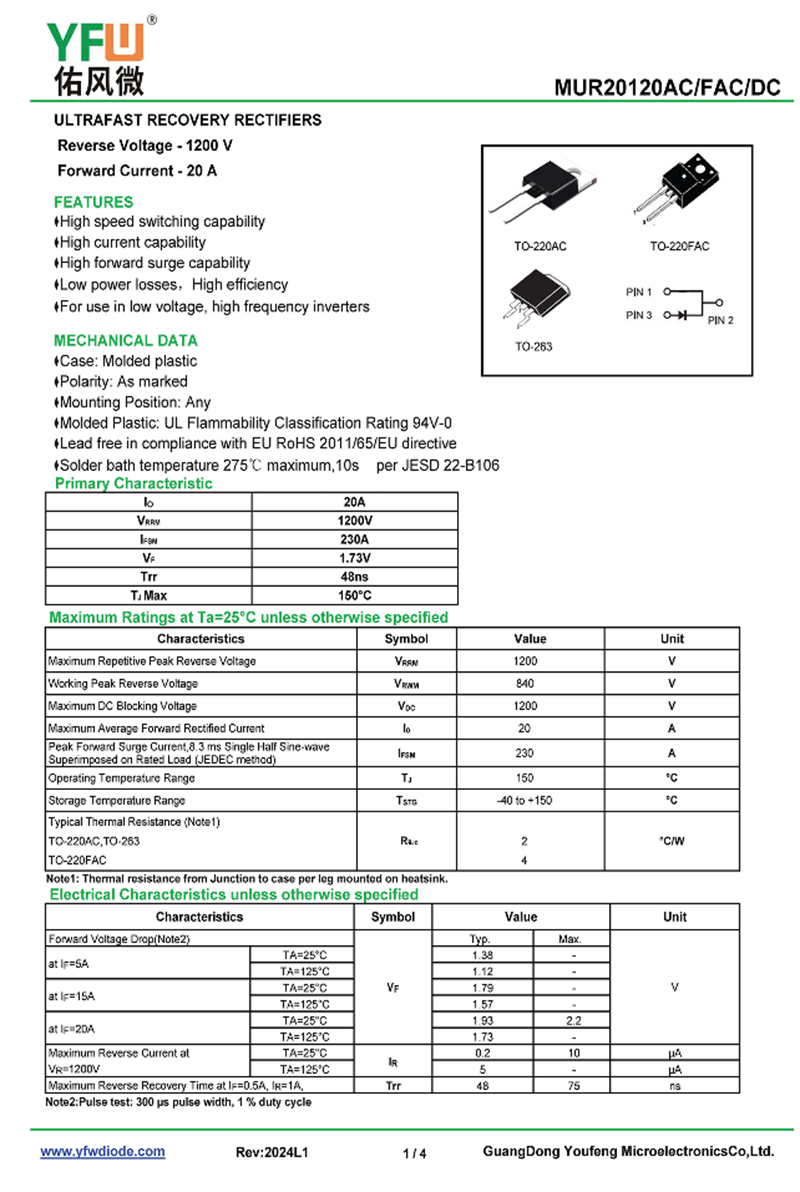 佑風(fēng)微原廠 超快恢復(fù)整流器MUR20120FAC 中文資料,PDF數(shù)據(jù)手冊,引腳圖,封裝規(guī)格,廠家原廠,找MUR20120FAC 上佑風(fēng)微電子官網(wǎng)