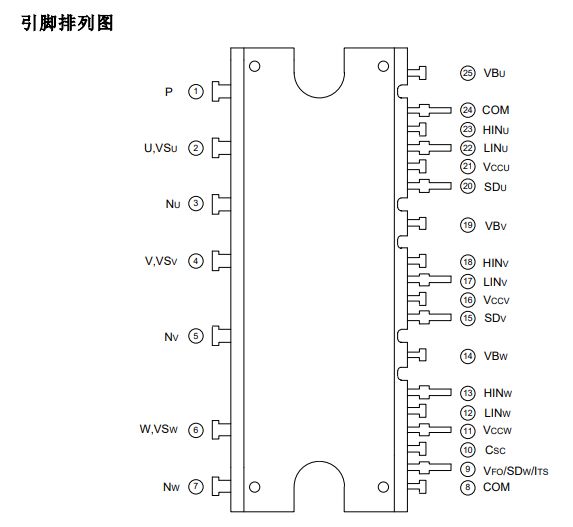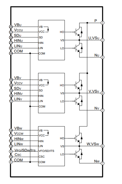 高度集成、高可靠性的三相無刷直流電機(jī)驅(qū)動電路,主要應(yīng)用于功率電機(jī)驅(qū)動。其內(nèi)置了6個(gè)IGBT和3個(gè)半橋HVIC 柵極驅(qū)動電路。