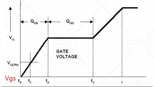 驅(qū)動(dòng)開通脈沖通過mos管的柵-源極對(duì)輸入電容Cgs充電,開啟時(shí)Vgs電壓=閾值電壓Vth,在此之前,mos管處于關(guān)斷狀態(tài)。此時(shí)只有很小的電流經(jīng)過mos管,Vds的電壓Vdd保持不變