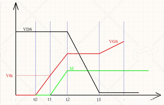 當(dāng)Vds電壓到達(dá)米勒平臺(tái)電壓Vgp時(shí),電流ID上升到負(fù)載電流的最大值ID,這時(shí),Vds電壓開始從Vdd下降。