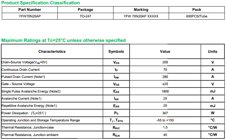 yfwdiode,Mosfet YFW70N20AP data,PDF data book,Pin figure,Packaging specifications,Diode manufacturer YFW70N20AP diode