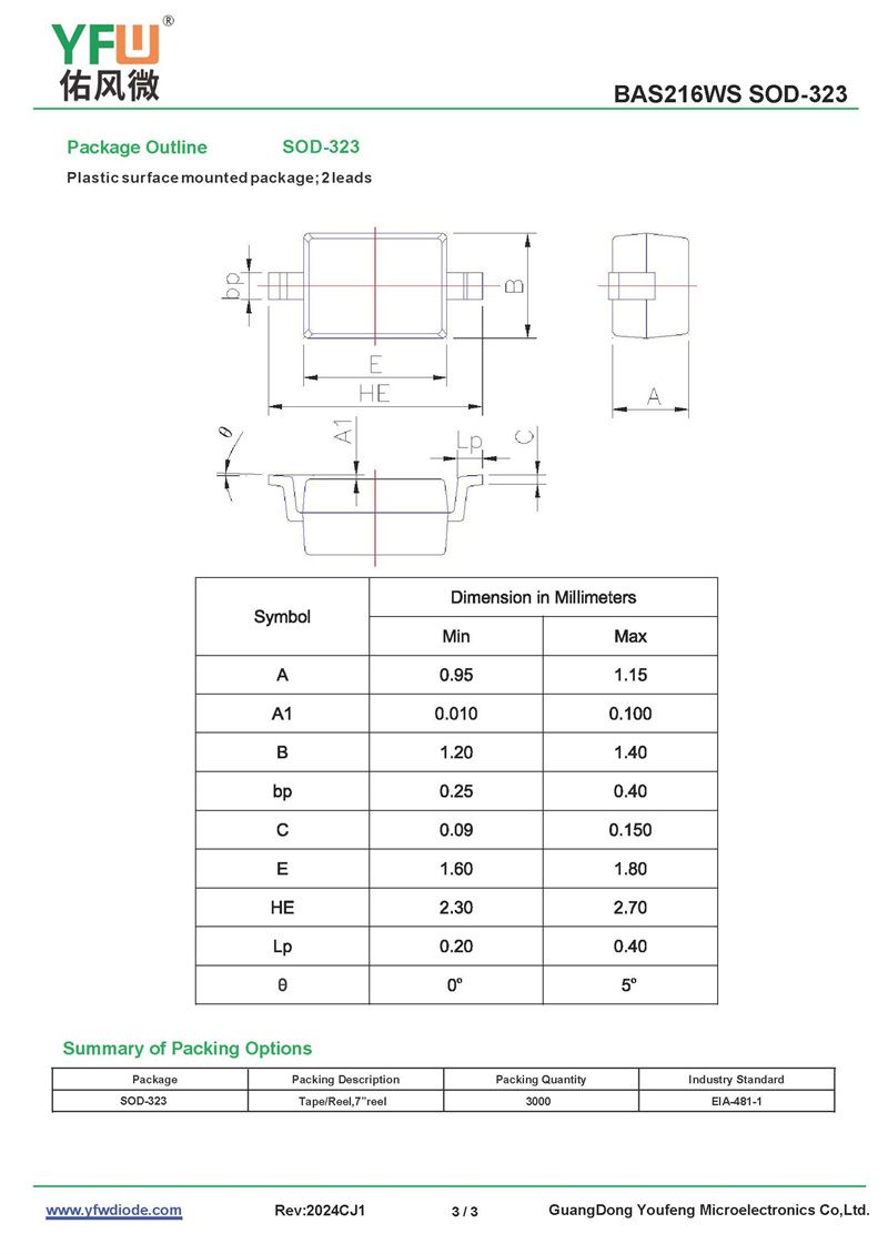 yfwdiode,Switching Diode BAS216WS data,PDF data book,Pin figure,Packaging specifications,Diode manufacturer BAS216WS diode