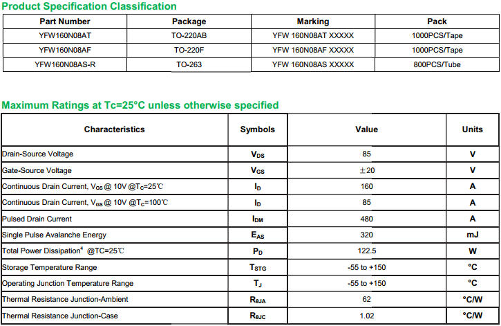 yfwdiode,MOSFEL YFW160N08AS data,PDF data book,Pin figure,Packaging specifications,Diode manufacturer YFW160N08AS diode