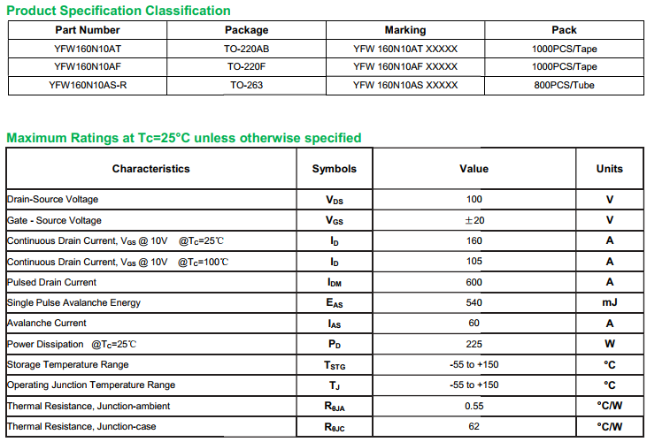 yfwdiode,MOSFEL YFW160N10AS data,PDF data book,Pin figure,Packaging specifications,Diode manufacturer YFW160N10AS diode