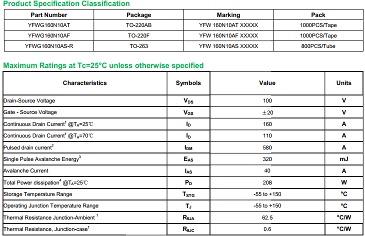 yfwdiode,MOSFEL YFWG160N10AS data,PDF data book,Pin figure,Packaging specifications,Diode manufacturer YFWG160N10AS diode
