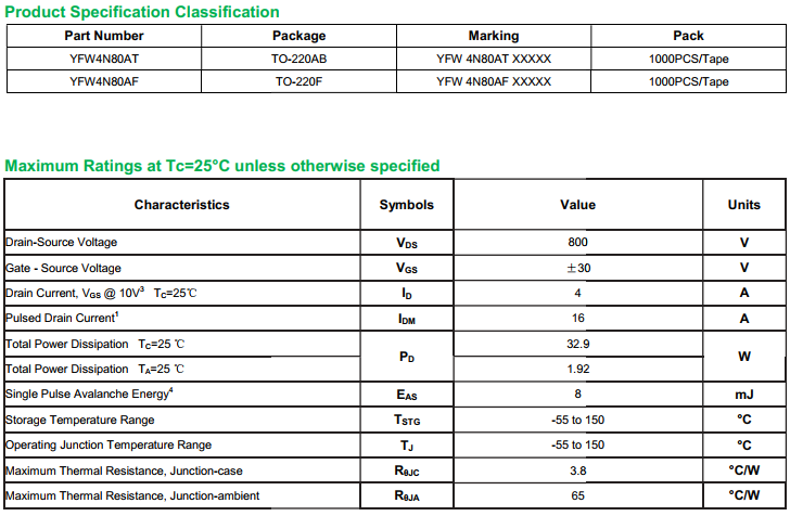 yfwdiode,MOSFEL YFW4N80AT data,PDF data book,Pin figure,Packaging specifications,Diode manufacturer YFW4N80AT diode