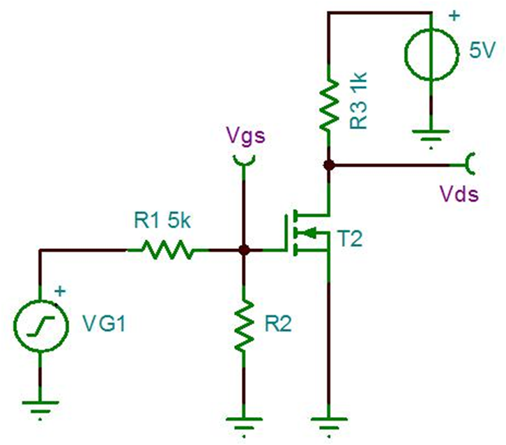 Take an NMOS switch circuit as an example, where step signal VG1 sets the DC level to 2V and is a square wave with an amplitude of 2V and a frequency of 50Hz and the turn-on voltage of T2 is also 2V, which causes the MOSFET T2 to switch between the on and off states with a period 20ms.